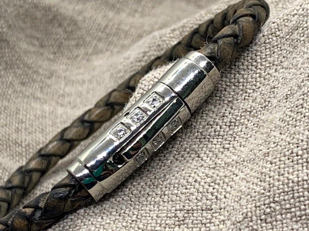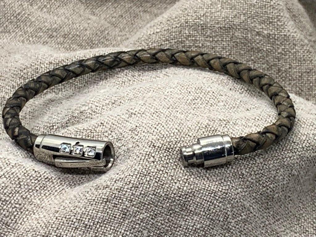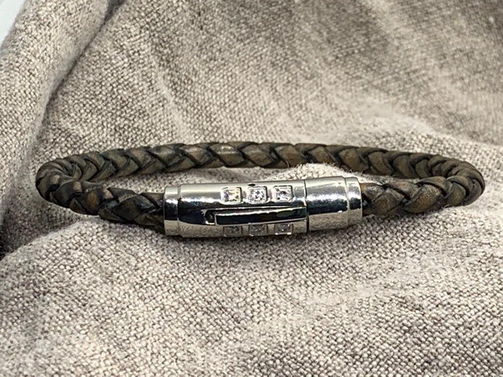 A touch of crisp of rhinestones defines a handcrafted bracelet made with rich braided leather.