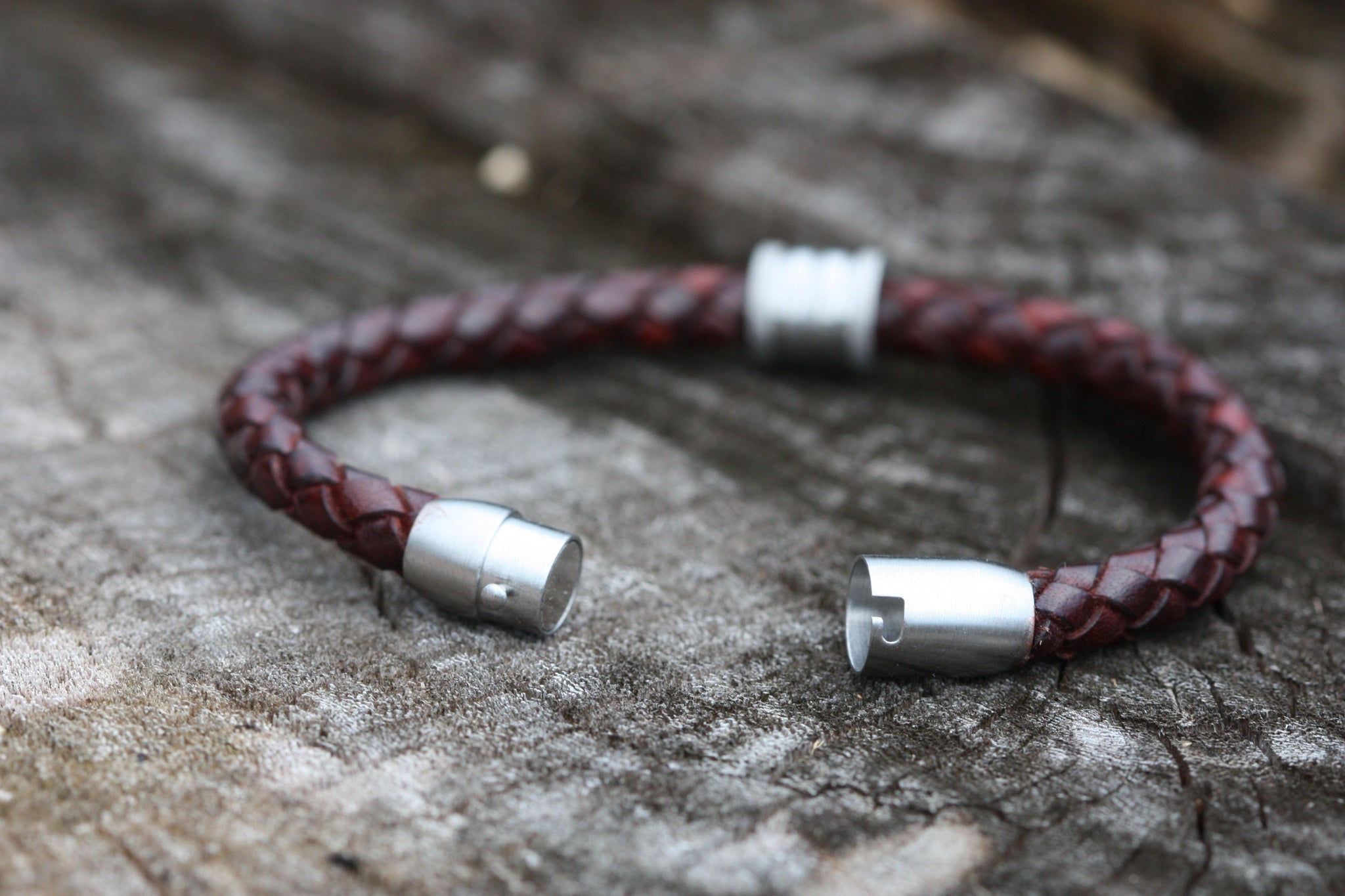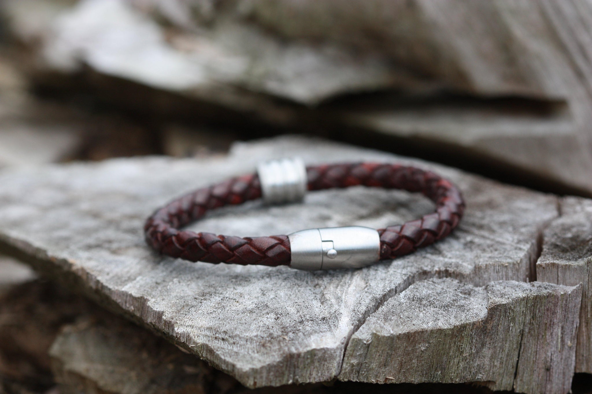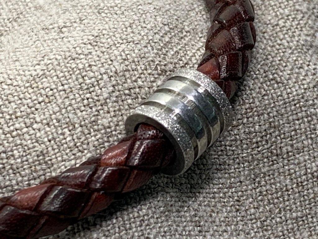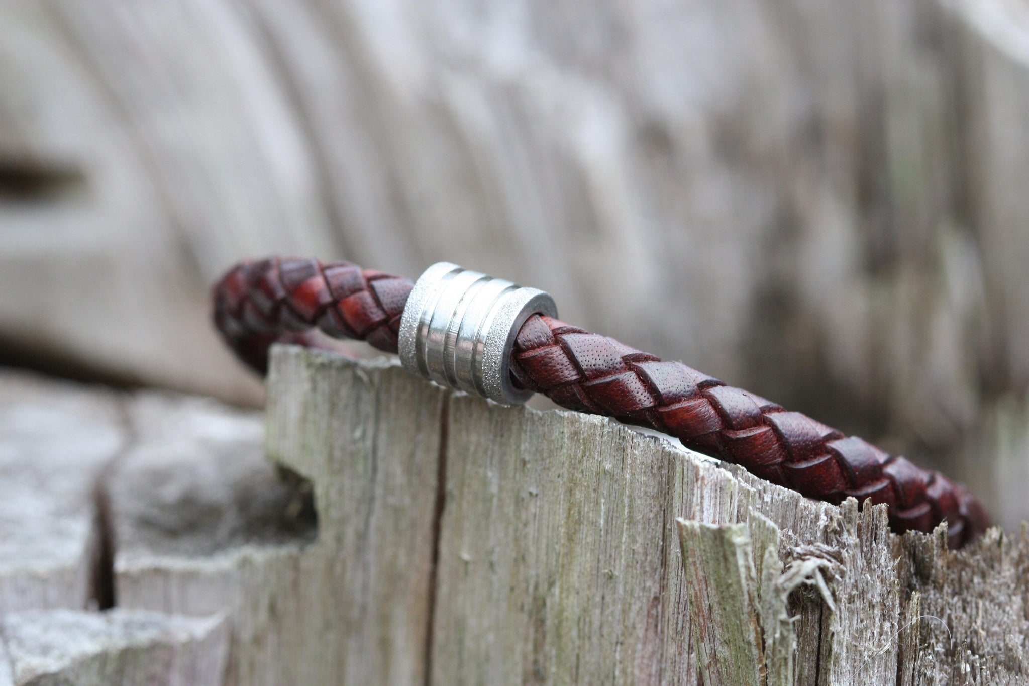 Stainless steel accents elevates a versatile bracelet fashioned from natural braided leather.