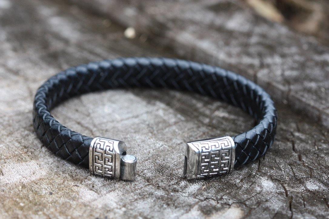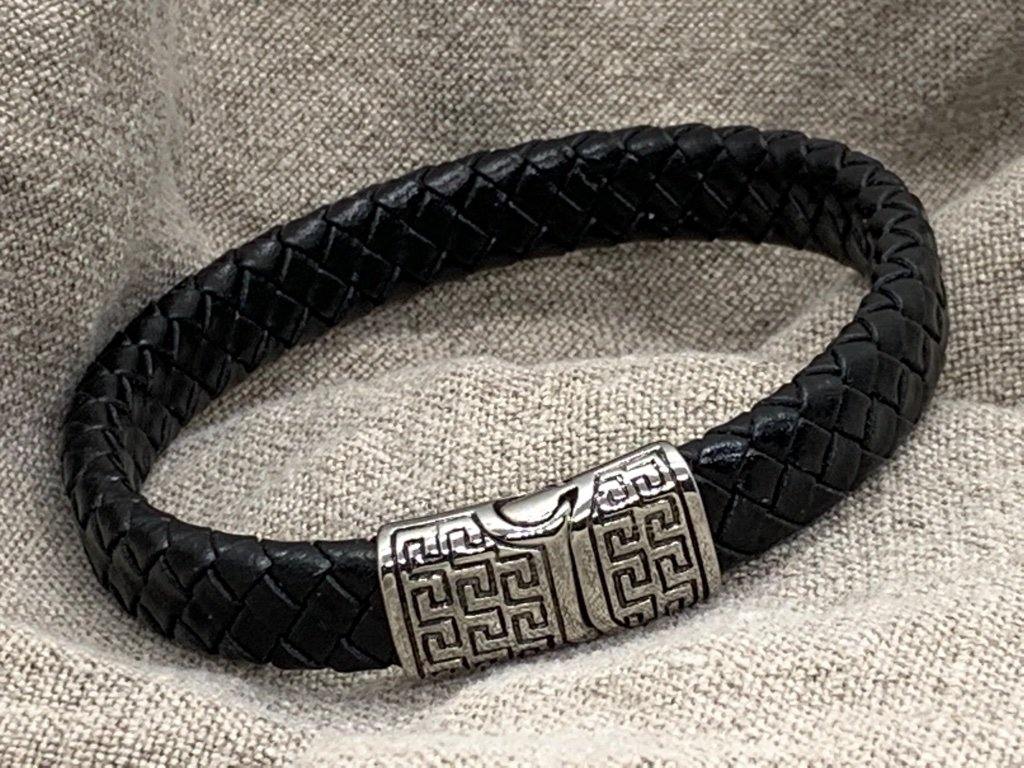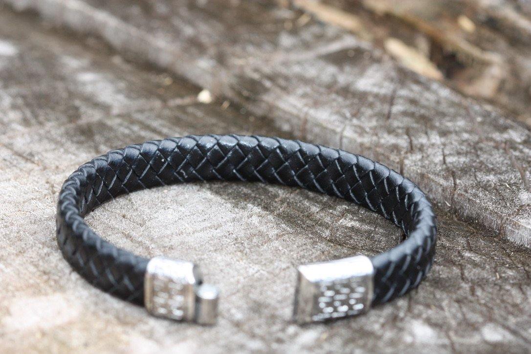 This finely crafted bracelet features a braided leather band finished with a splendid stainless steel debossed clasp.