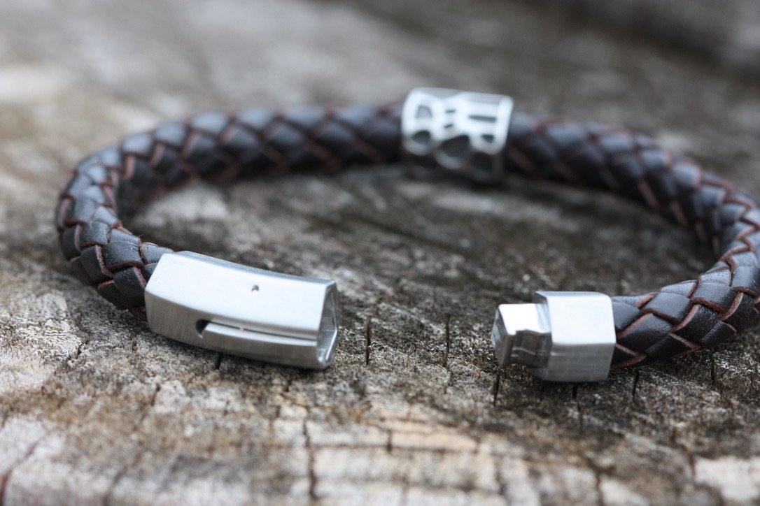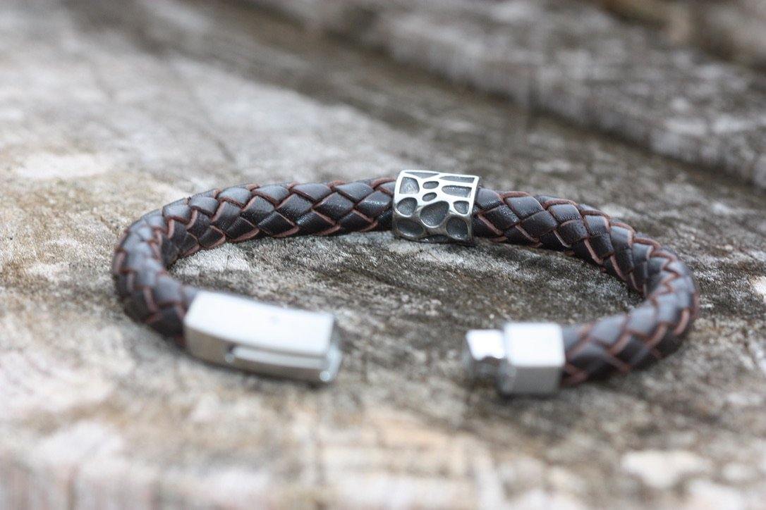 This intriguing textured charm combined with braided leather makes this bracelet a head-turning piece.