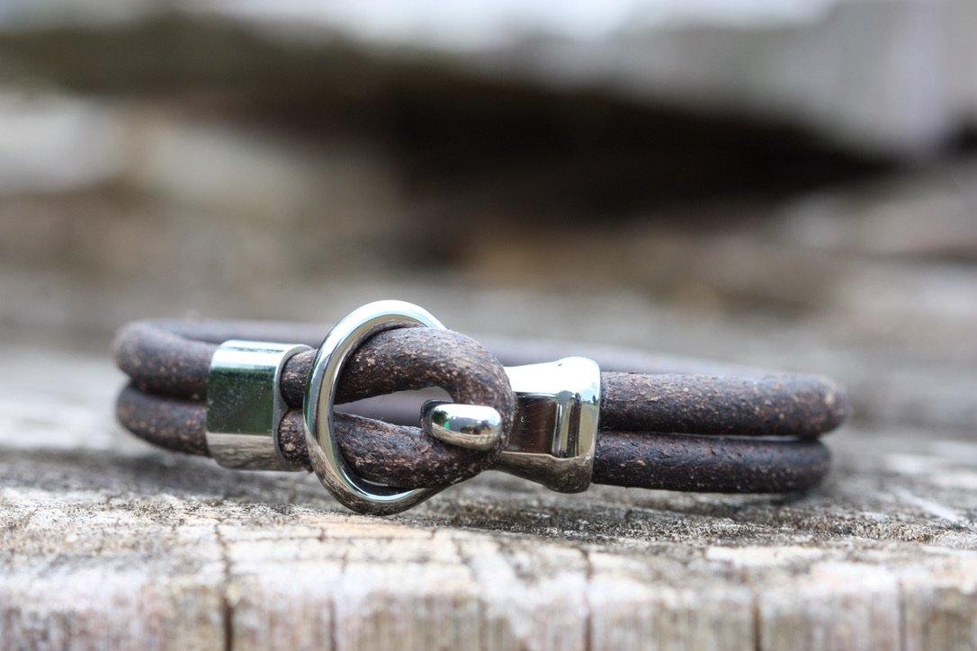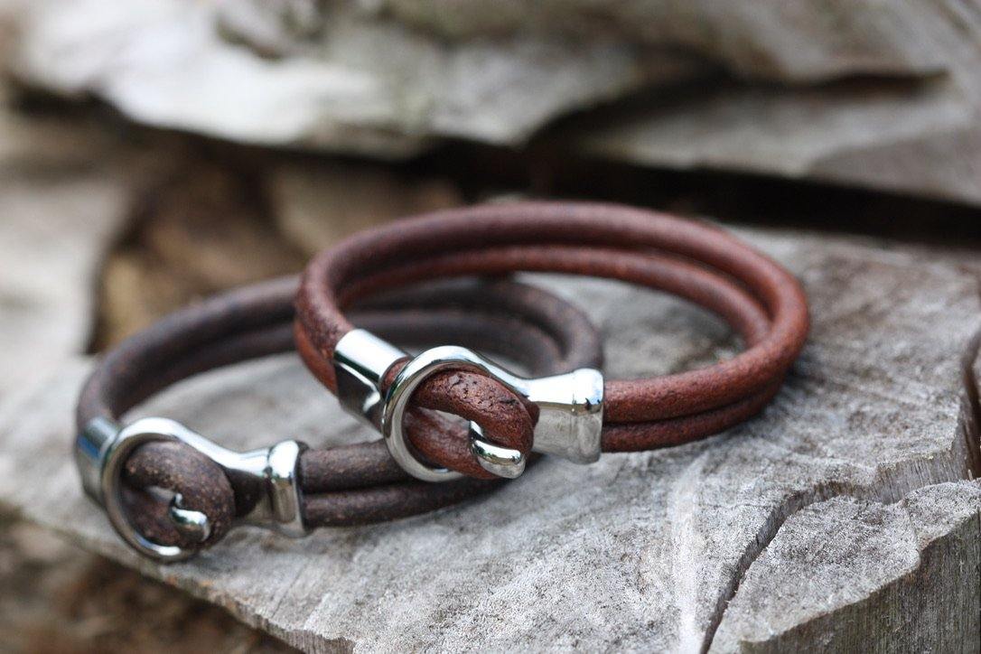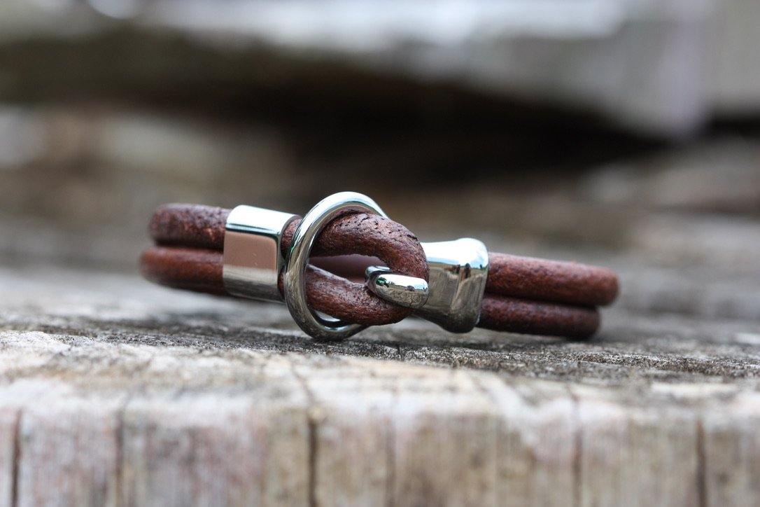 Open hook and charm hardware adds a lustrous touch to a handsome bracelet fashioned from richly colored leather.